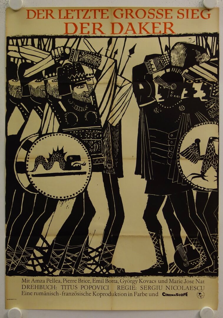 Originales DDR Filmplakat der Erstaufführung. Papier ist sehr brüchig und das Plakat fällt an den Falzen auseinander. Es wurde teilweise mit Papierklebestand verstärkt, braucht aber eine professionelle Restaurierung. Mit Pierre Brice, Marie-José Nat, Georges Marchal, Regie Sergiu Nicolaescu.