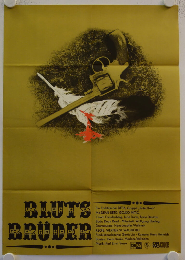 Original release east-german movie poster for the DEFA western. With Dean Reed, Gojko Mitic, Gisela Freudenberg, directed by Werner W. Wallroth.
