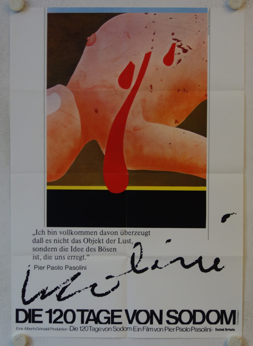 Original release german movie poster. A total of eight different A1 poster were produced for the film, some of them are rarer than others. This style is one of my two favorites and is definitely one of the rarer posters from the lot. With Paolo Bonacelli, Giorgio Cataldi, directed by Pier Paolo Pasolini.